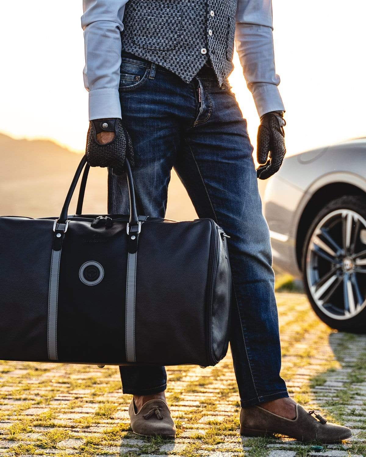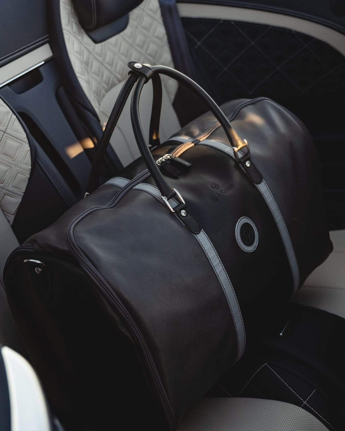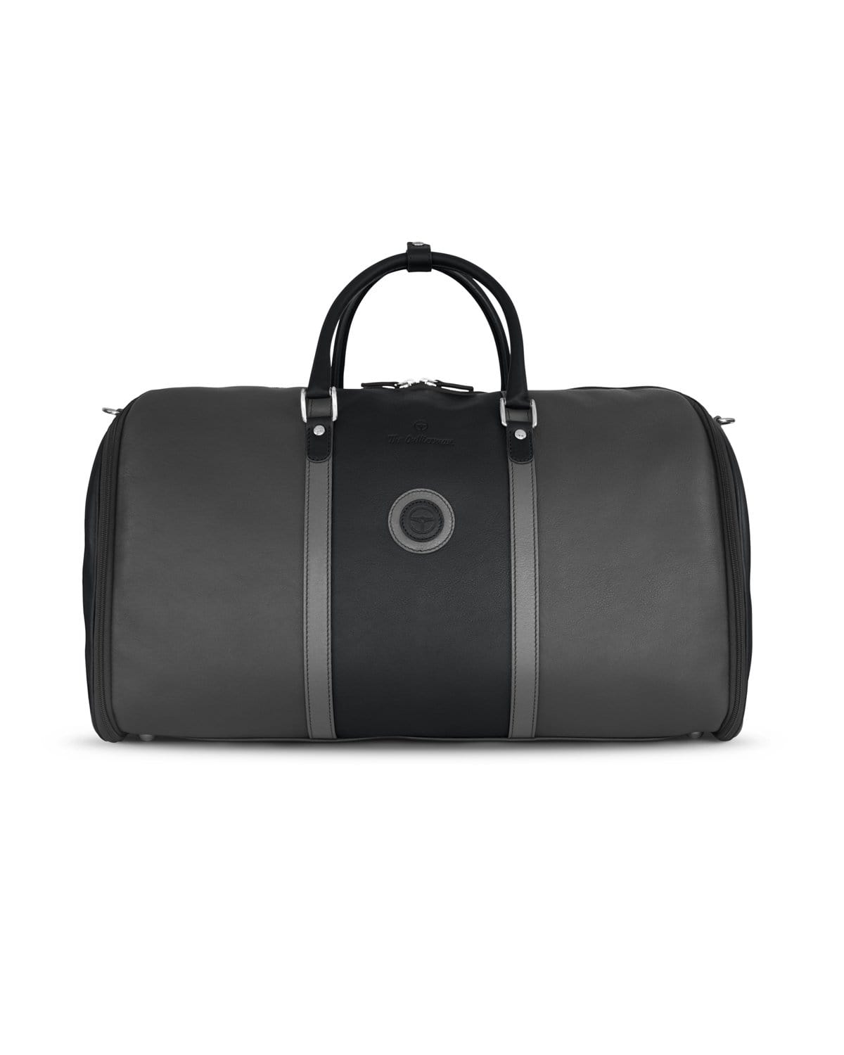 This weekender garment bag is perfect for showing off your distinctive style even while you are traveling. Thanks to a zipper that runs around its entire perimeter, it can be fully opened and laid out flat exposing the interior pockets and the garment case that is equipped with two detachable hangers and a zip closure to easily place your clothes and accessories . The perfect combination of driving passion and functionality, entirely handmade in Italy using lava, black and grey leather and an inner lining made of 100% cotton drill fabric featuring “Outlierman’s Roads” pattern. A masterful tribute to the interiors and exteriors of legendary classic cars.
