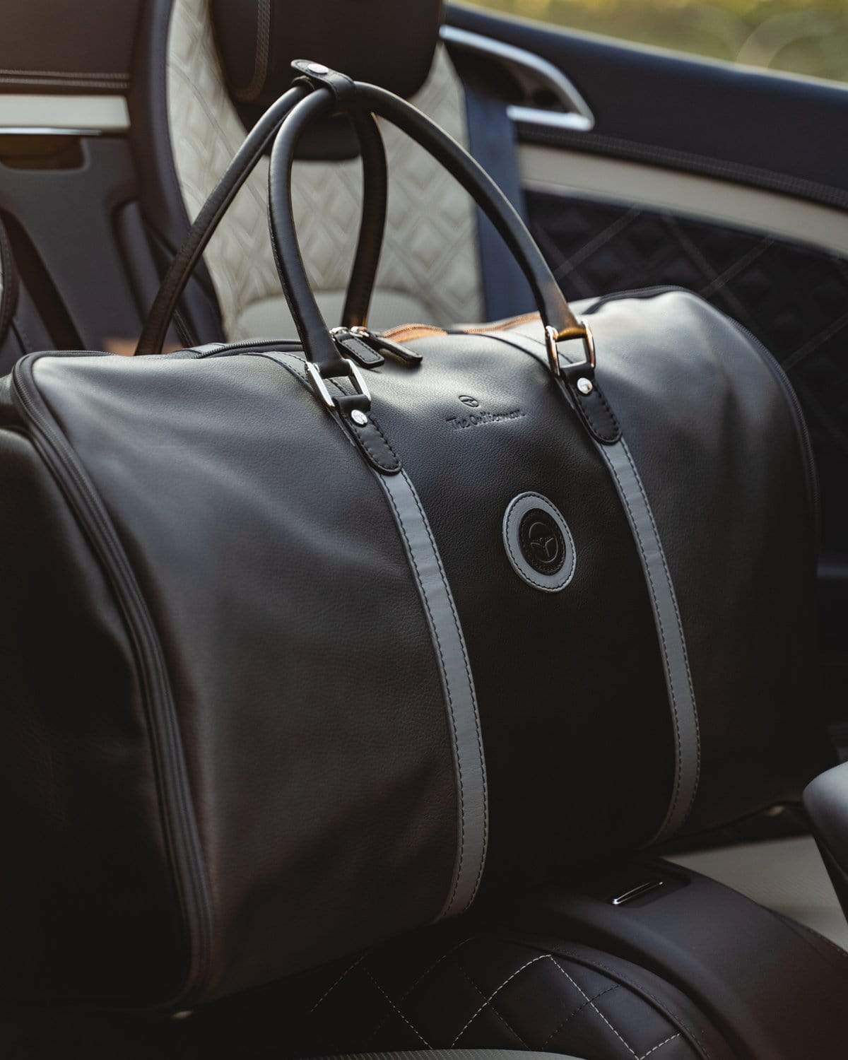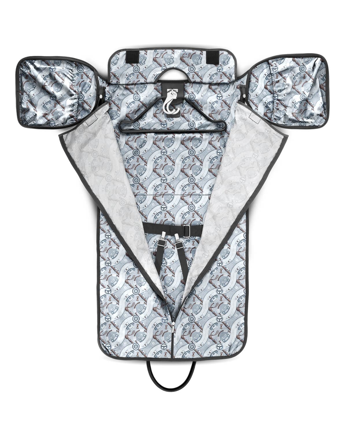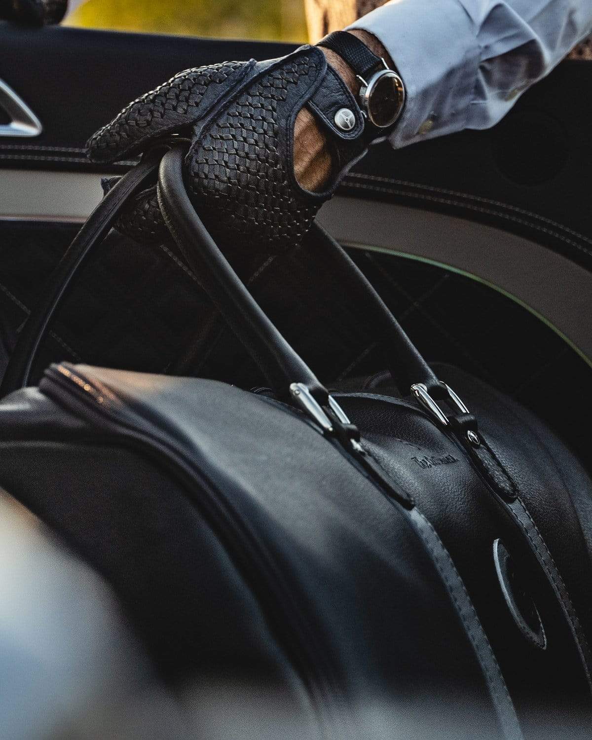 This weekender garment bag is perfect for showing off your distinctive style even while you are traveling. Thanks to a zipper that runs around its entire perimeter, it can be fully opened and laid out flat exposing the interior pockets and the garment case that is equipped with two detachable hangers and a zip closure to easily place your clothes and accessories . The perfect combination of driving passion and functionality, entirely handmade in Italy using lava, black and grey leather and an inner lining made of 100% cotton drill fabric featuring “Outlierman’s Roads” pattern. A masterful tribute to the interiors and exteriors of legendary classic cars.