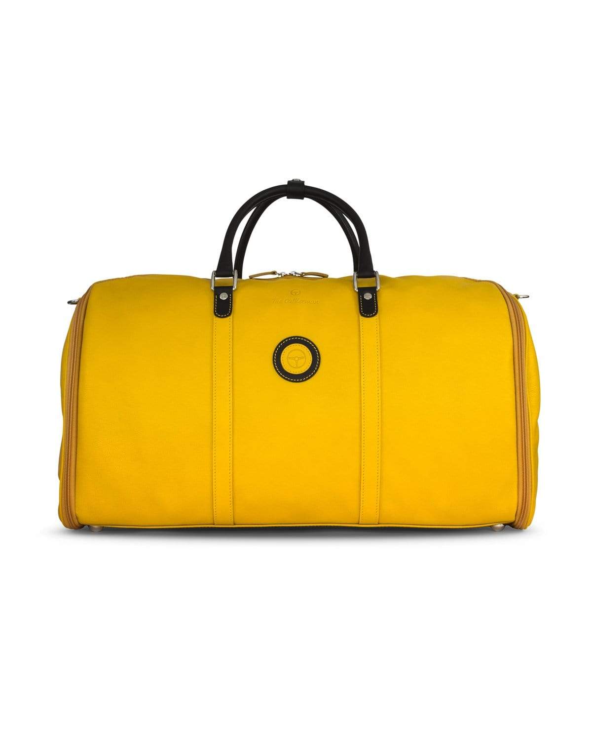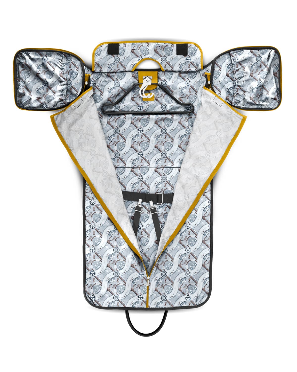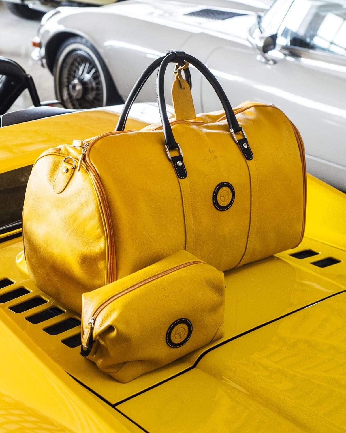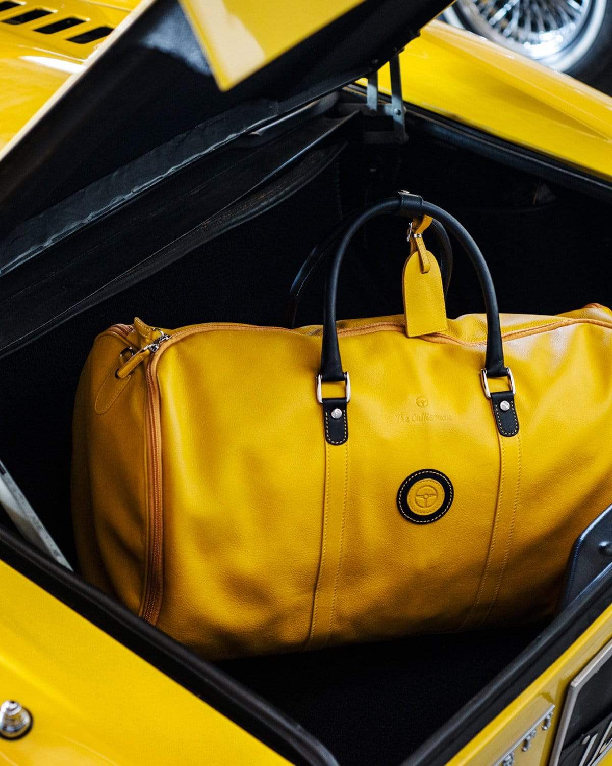 This weekender garment bag is perfect for showing off your distinctive style even while you are traveling. Thanks to a zipper that runs around its entire perimeter, it can be fully opened and laid out flat exposing the interior pockets and the garment case that is equipped with two detachable hangers and a zip closure to easily place your clothes and accessories . The perfect combination of driving passion and functionality, entirely handmade in Italy, using yellow leather with black details and an inner lining made of 100% cotton drill fabric featuring “Outlierman’s Roads” pattern. A masterful tribute to the interiors and exteriors of legendary classic cars.